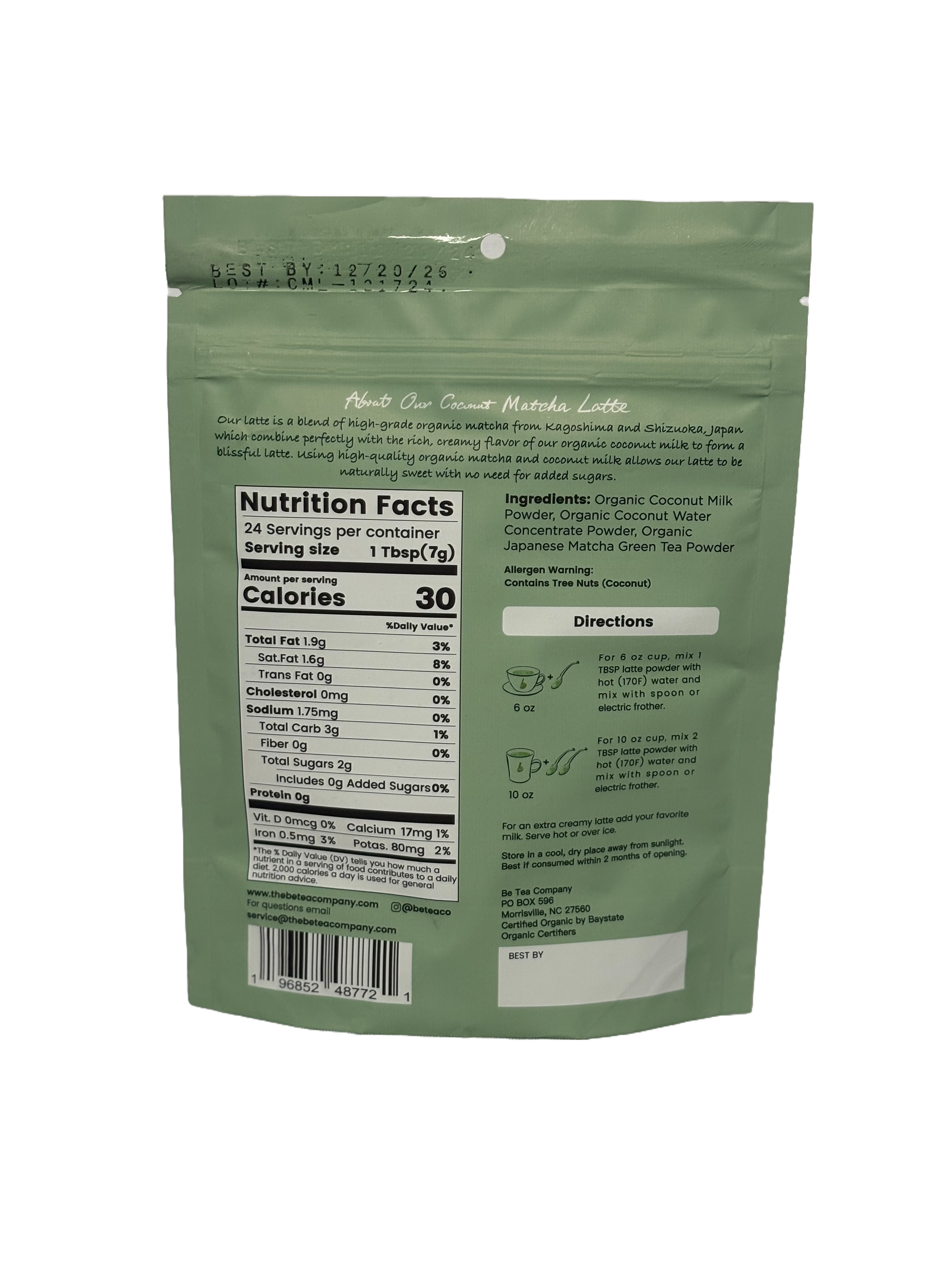 Ingredients: Organic Coconut Milk Powder, Organic Coconut Milk Extract, Organic Japanese Matcha